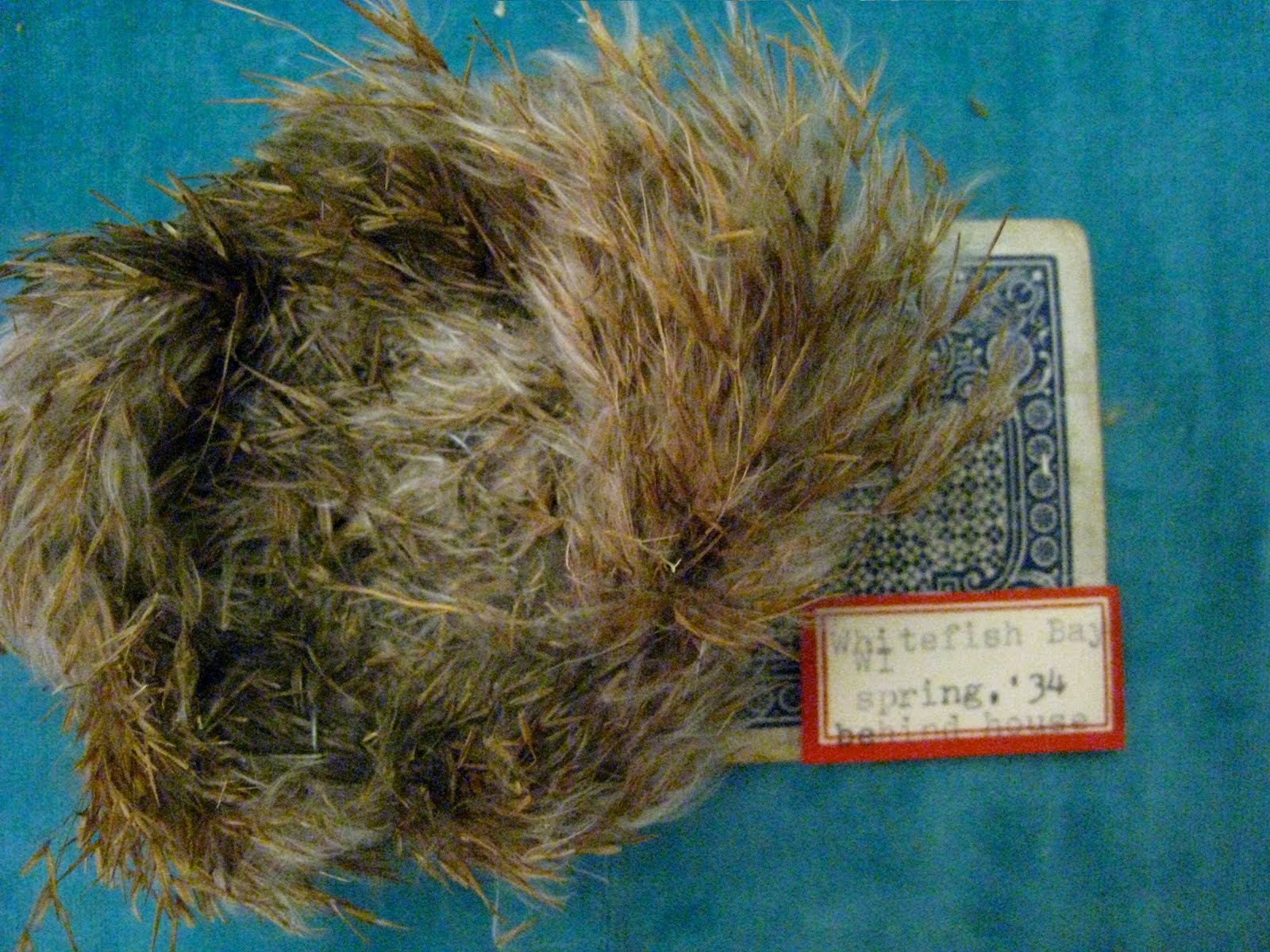 The premise: It's Bernice's nest collection. Collected 1934-37, from different towns in Wisconsin. Bernice was an avid bird watcher and travelled around Wisconsin with her family. Everywhere they went, she searched the ground for fallen bird nests. She always looked around to make sure she wasn't disturbing an active family home and then would wrap the nest carefully and bring it back with her. Proud of her collection, with the help of her father, she mounted each nest and framed her collection.